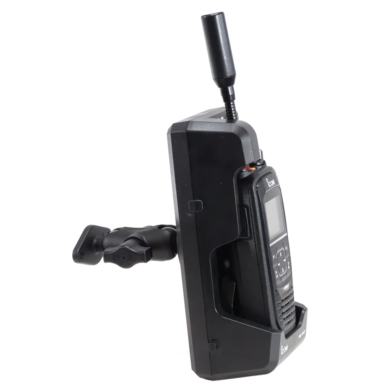 Docking station, works kitch DC power supply of 9-32V, anti-theft function. Supplied with the DC cable, multiplug AC adapter and cable adapter. Mounting kit (standard AMPS or UNC hole pattern) and antenna not included